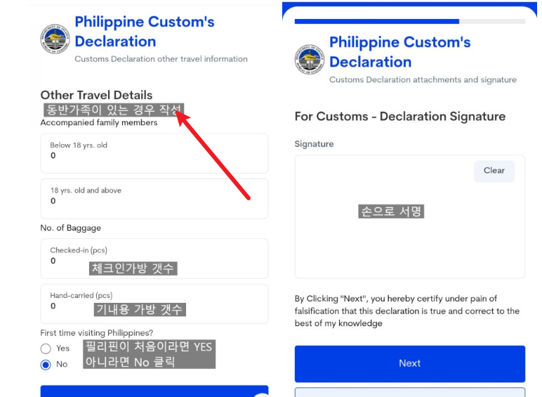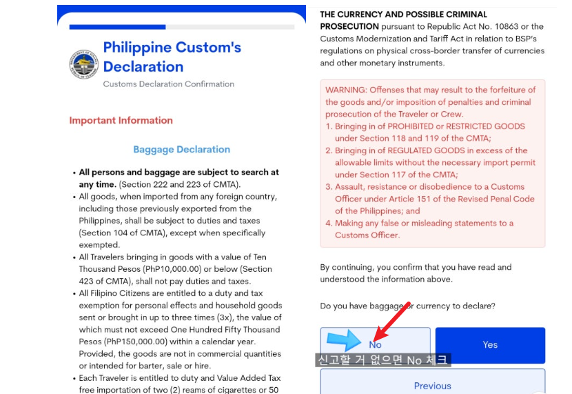 필리핀 이트래블 마지막 단계에서는 세관 신고(Customs Declaration) 섹션이 등장합니다.