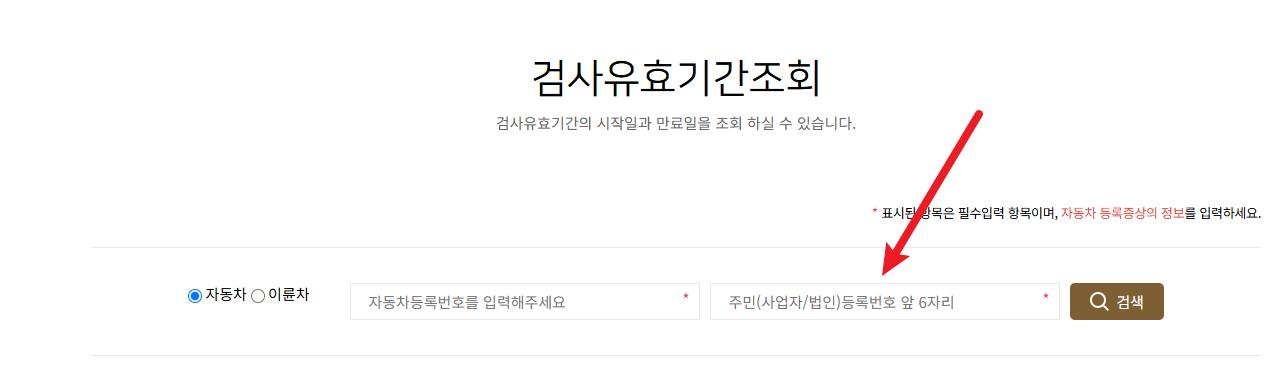 검사유효기간조회 검사유효기간의 시작일과 만료일을 조회 하실 수 있습니다. * 표시된 항목은 필수입력 항목이며, 자동차 등록증상의 정보를 입력하세요. ※ 주민등록번호 수집근거 : 자동차