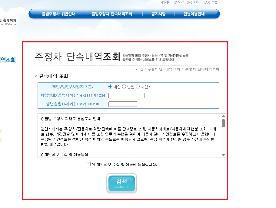 차량번호, 위반일자(또는 고지서번호), 차량소유자 생년월일을 정확히 입력합니다. 렌터카의 경우 렌터카 업체 정보를 입력해야 합니다.