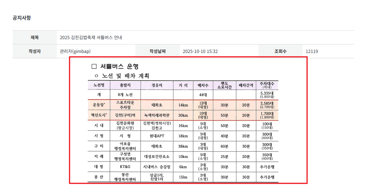 공영주차장이 만차일 경우 김천고등학교 운동장(축제 기간 한정 개방)과 김천교육지원청 주차장을 이용할 수 있습니다. 셔틀버스가 10분 간격으로 운행됩니다.
