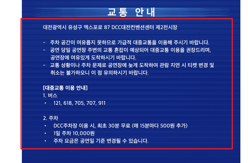공연 당일 혼잡을 피하기 위해서는 대중교통 이용을 추천드립니다.