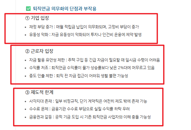 - 문제점: 수익률 저조, 중소기업 부담, 개인의 자금 활용 자유 축소